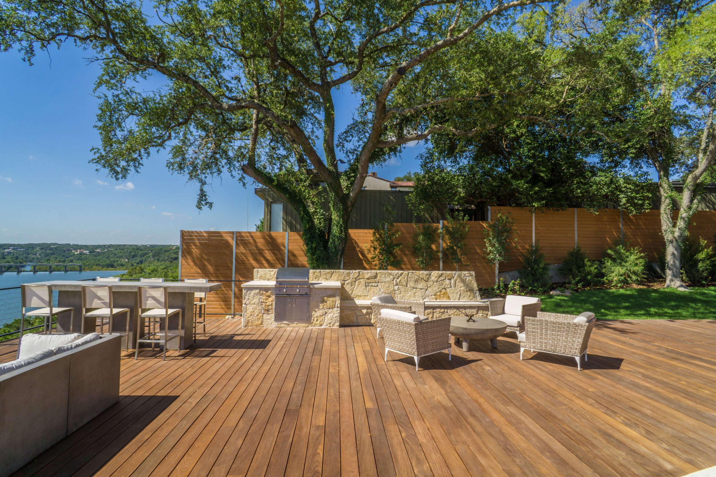 Perched above the shoreline of Lake Austin just north of the Colorado River Dam which separates Lake Austin from Lady Bird Lake sits the Laguna Loma Lake House. The massive Ipe deck provides unsurpassed views of the lake, downtown Austin, the dam, even everyone's favorite local coffee roasters: Mozart's. Completely redesigned and renovated by Vogel Builders, this weekend home has custom features inside and out, from the elevator and wood accent walls to the protruding steel box that encompasses the master bedroom. The sizable multi-level Ipe deck is a living space all it's own with a triangular pool and spa, an outdoor kitchen, a dining area, a living area and row of lounge chairs, all providing unobstructed views for miles thanks to the steel cable railing. Built by Centex Decks, the Ipe Hardwood decking perfectly compliments the Clear Cedar siding of the home and will stand the test of time as well as any other material used on the exterior.